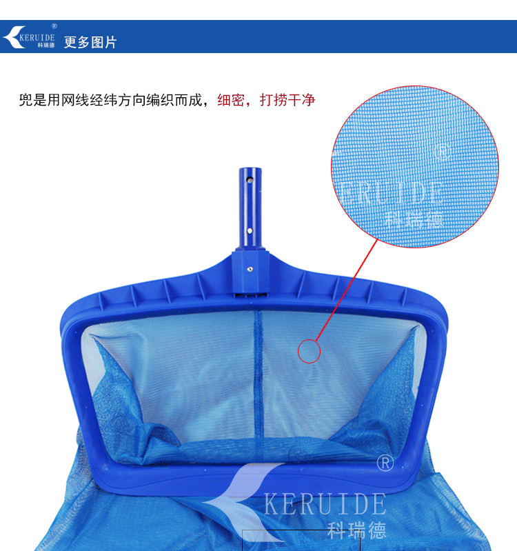 【游泳池深水网】:网兜大而深,网格细密,可打捞可见的各种杂物。主要用于打捞水中及水底的脏物及水中的小虫等。