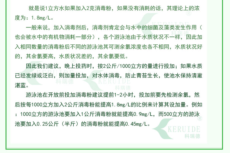 1、使用含氯消毒粉时水的PH值会下降,请注意使用PH调节剂将PH保持在7.0-7.8之间;