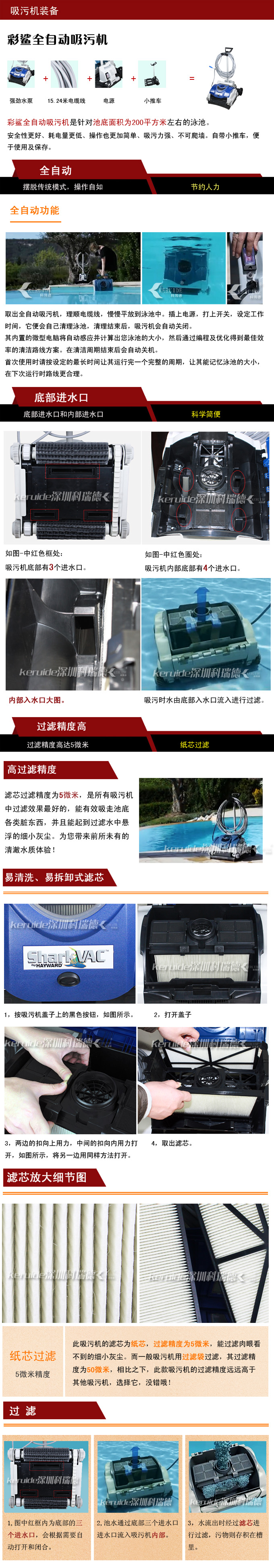 【优点】:彩鲨吸污机的过滤精度高达5微米,是所有吸污机中过滤效果较好的,能有效吸走池底各类脏东西,并且能起到过滤水中悬浮的细小灰尘。清洗方便,有透明窗可以看到机器里的脏物是否需要清洗。