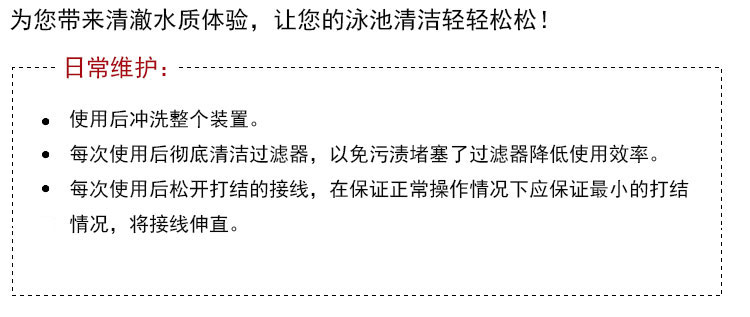 【用法】:取出虎鲨游泳池吸污机理顺电缆线,站长岸边慢慢平放到泳池中,然后插上电源,打上开关,设定工作时间后,它便会自己清理泳池。清理结束后虎鲨会自动停止工作。首次使用时请按设定的最长时间让其运行完一个完整的周期,让其能记忆泳池的大小,在下次运行时路线更合理。