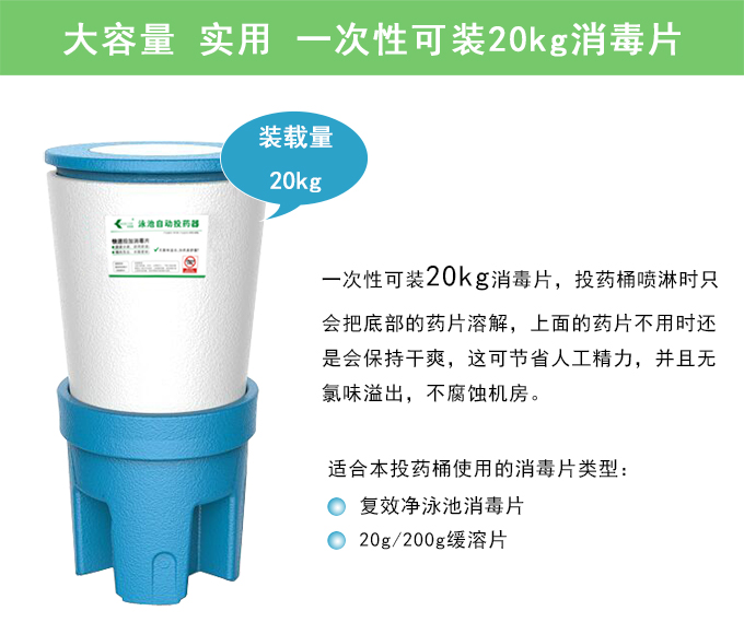 科瑞德®泳池自动投药器是用于投加固体消毒片的投药器,也叫泳池自动加药桶,其采用的固液分离、即用即溶、桶内负压、水隔式密封等技术手段,使得投药器很适合用来自动投加固体消毒片,并且在投放过程中不会有氯味溢出。另外它还有一个特点,就是装载量大,一次性可装20kg的消毒片,可用的消毒片有复效净泳池消毒片、泳池缓溶片等。