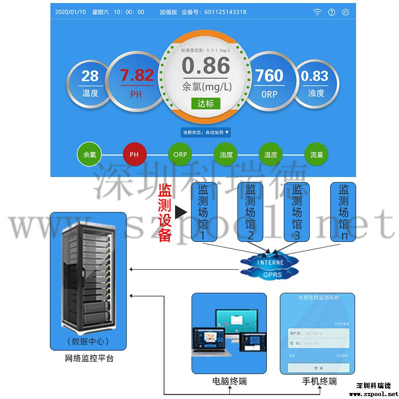 本WEPOOLS卫普士水质在线监测系统基于互联网与移动互联网技术,解决方案实现了城市区域内各个游泳场馆水质的远程在线监测,包括了数据自动采集、无线传输、云端储存及分析处理、预警、投药等功能的水质远程在线监控系统。