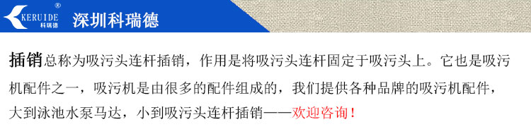 插销总称为吸污头连杆插销,作用是将吸污头连杆固定于吸污头上。它也是吸污机配件之一,吸污机是由很多的配件组成的,我公司提供吸污机配件全:各种品牌的,大到泳池水泵马达,小到吸污头连杆插销。